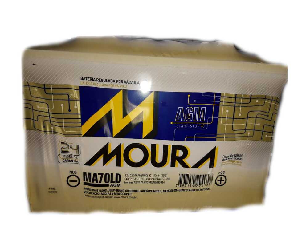 BATERIA AUTOMOTIVA MOURA START STOP - TECNOLOGIA AGM - 12V 70Ah - 24 MESES DE GARANTIA - MA70LDDIMENSÕES (CxLxA): 280x190x180mm Antes da compra, verifique as medidas da sua bateria, pois não serão aceitas trocas por medidas incompatíveis DESCRIÇÃO: A bateria para aplicação start stop é feita para suportar uma quantidade maior de partidas do motor do automóvel. Essas baterias têm um ciclo de vida 3x maior do que a convencional. As baterias AGM (Absorbent Glass Mat) são destinadas para automóveis de alta performance que exigem mais das baterias. Em português, a sigla significa “manta de fibra de vidro absorvente” e tem como principal característica a absorção total da solução ácida (eletrólito) em seus separadores. Com isso, a bateria não derrama líquido, não degrada, como ocorre na bateria inundada, e não sulfata. Isso acontece porque o separador AGM mantém o eletrólito em suspensão, mantendo-o em contato constante com o material ativo das placas, o que também resulta numa maior eficiência quando ambas descarregam e recarregam proporcionando mais durabilidade que as baterias convencionais e desempenho elétrico para o automóvel. CARACTERÍSTICAS:- Tensão: 12V- Capacidade (C20): 70Ah;- CCA (ABNT -18°C): 760A;- Dimensões CxLxA: 280x190x180mm;- Peso: 20,6 kg;- Polaridade: Direita. PRINCIPAIS APLICAÇÕES:- Jeep Grand Cherokee Laredo/Limited- Mercedes Benz Classe B180/B200- Volvo XC60- Audi A3- Mini Cooper CONTEÚDO: 01 (uma) bateria 70Ah / 12V.